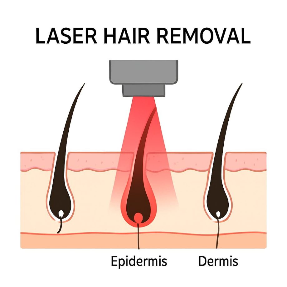 Laser hair removal uses concentrated light to target hair follicles. The laser emits light, which is absorbed by the pigment in the hair, damaging the follicle and inhibiting future hair growth. This process is effective on various body parts.