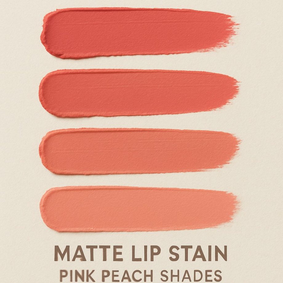 Matte lip stains in pink peach shades are a beauty staple. They offer a natural, versatile look for any occasion.